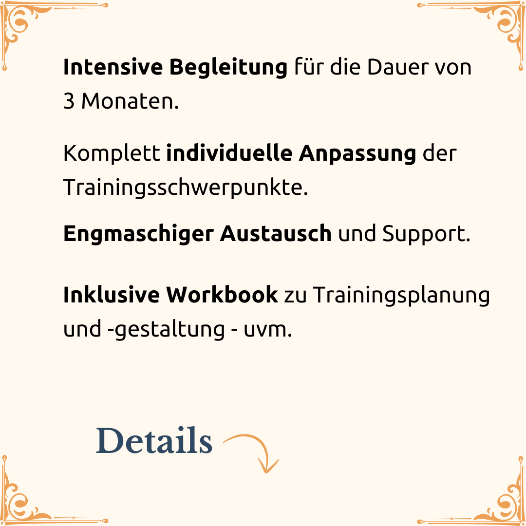 Hast du Interesse an 1:1 Unterstützung, dann buche dir bitte ein Erstgespräch. Hier lernen wir einander via Zoom kennen und tauschen uns kurz über die Themen aus, bei denen ich dich unterstützen soll. Dabei klären wir auch, ob ein Training vor Ort in Frage kommt - oder, ob wir über Onlineunterricht & Videoanalyse miteinander arbeiten wollen.