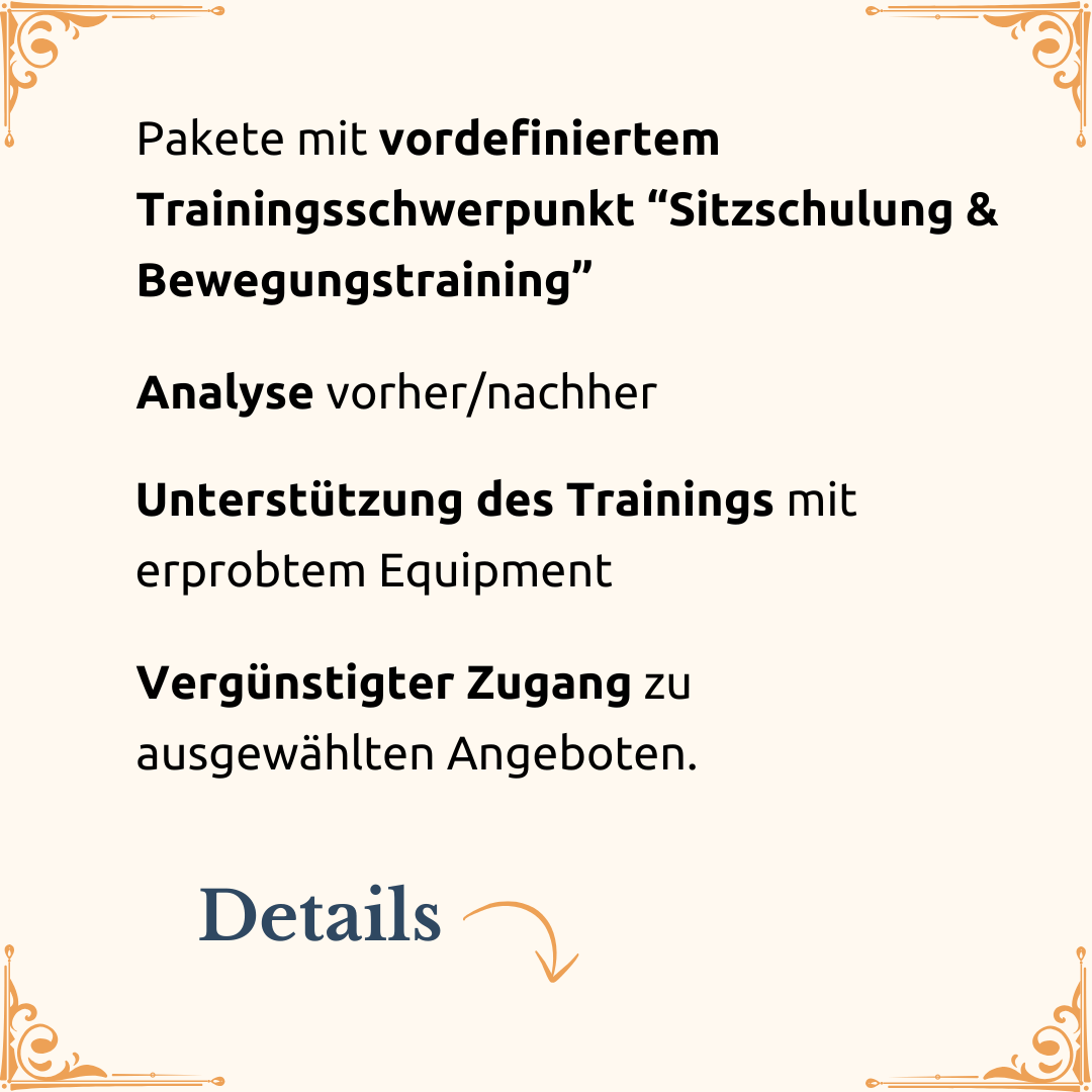 Der Schwerpunkt meiner Arbeit liegt auf reitweisenübergreifender Sitzschulung und individuell angepasstem Training für den Vierbeiner. Ich unterstütze dich gezielt beim Aufbautraining, das sowohl Körperarbeit als auch Koordinationstraining für dein Pferd umfasst.